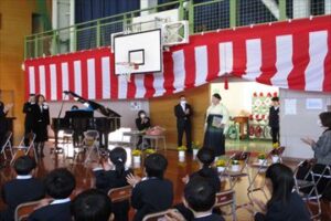 12月4日(木)4年生に「夢の音楽教室」が行われました。今年は、バイオリニストの早稲田桜子さん、ピアニストの早稲田眞理さんに来ていただきました。