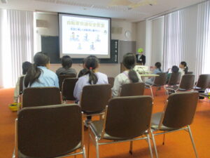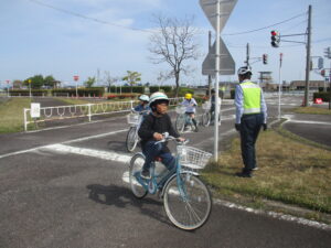 交通指導員の方に、自転車に乗るときの注意点や基本技術を教えて頂いたり、標識や信号をよく見て走行したりする練習を行いました。