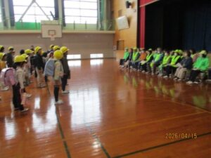 4月15日(水)感謝の思いを伝える「東加積小児童防犯パトロール隊出発式」を体育館で行いました。雨のなか、22名ものパトロール隊の皆様(地域の方々や保護者の皆さん)が来校くださいました。東加積地区社会福祉協議会の石若さん、北加積駐在所の所長さんから、登下校時や帰宅後に気を付けること、不審者から身を守る方法について、分かりやすくお話しいただきました。
