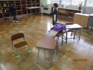 ランチルームでの給食が始まりました。縦割り班のひとつの班が、給食当番を担当しています。とても手際よく よそっていました。