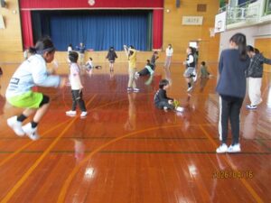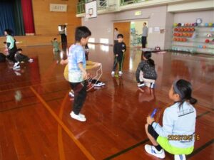 4月16日(木)第2校時の後の「さわやかタイム」に全校でなわとびをしています。1~6年生で構成された4つの「たてわり班」に分かれて、自分の挑戦している跳び方に取り組んでいます。上級生がやさしく声をかけたり、一緒に跳んだ数を数えたりする中で、笑顔や「できた!」の声が広がっています。体を動かす楽しさとともに、仲間と支え合う心も育っています。