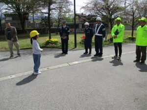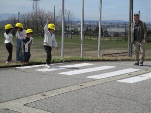 4月13日(月) 入学して間もない1年生と2年生が参加する交通安全教室を行いました。滑川警察署、交通安全協会、市の生活環境課の方々が来校してくださいました。滑川警察署の方から、安全で正しい横断の仕方を教わった後、実際に歩道を歩き、横断歩道を渡りました。「しっかり止まって、右左右を見るといいよ。」「手を挙げるときは、運転手さんにしっかり見えるようにするよ。」など、一人一人にていねいに教えていただきました。今日、教わったことを生かして、安全に気を付けて過ごしてほしいです。