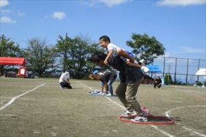 親子で息を合わせて二人三脚をして、おんぶで次の人へタッチしました。